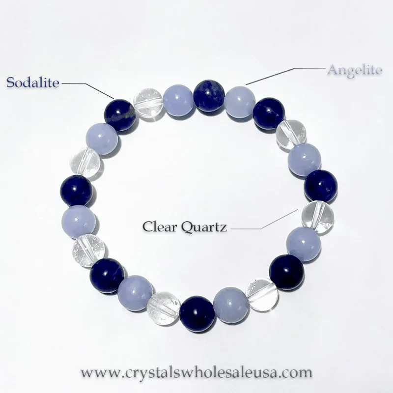 Speak from the heart and think with crystal clarity with this Clear Quartz, Angelite & Sodalite Bracelet. This soothing blue-and-clear combination is crafted to support calm communication, emotional balance, and intuitive insight. Angelite infuses gentle, comforting energy that quiets the mind and softens stress; Sodalite strengthens truth, logic, and self-expression; and Clear Quartz amplifies the intentions of both stones while bringing pure clarity. Perfect for everyday wear, meditation, and mindful work, this healing crystal bracelet helps you release tension, communicate confidently, and stay grounded in your truth. Its serene palette pairs beautifully with any outfit while supporting Throat, Third Eye, and Crown Chakra alignment.